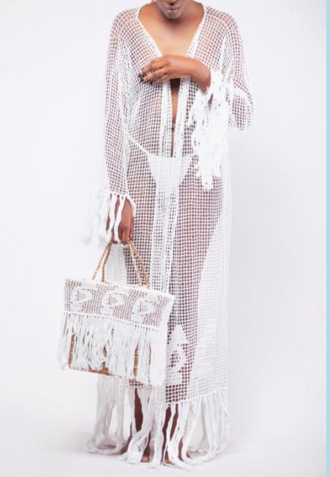 Capa branca, comprida e com motivos do Pensador (símbolo da cultura angolana), fato de banho. Materiais : linha 100% algodão e linha impermeável própria para peças usadas na água.