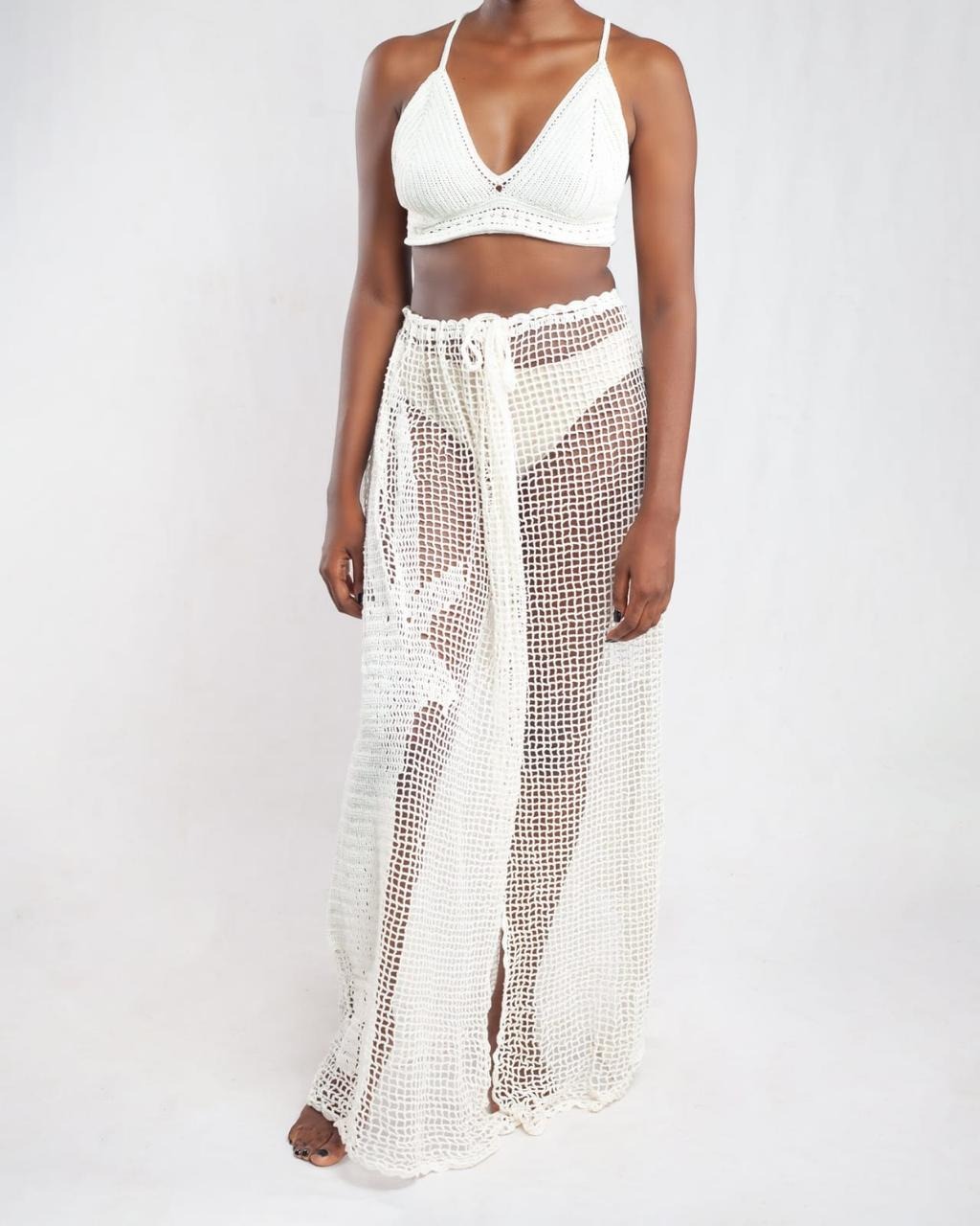 Saia de praia beige, com desenho da Palanca Negra Gigante (símbolo da cultura angolana). Materiais : mateba, linha e linha 100% algodão e linha impermeável própria para peças usadas na água.