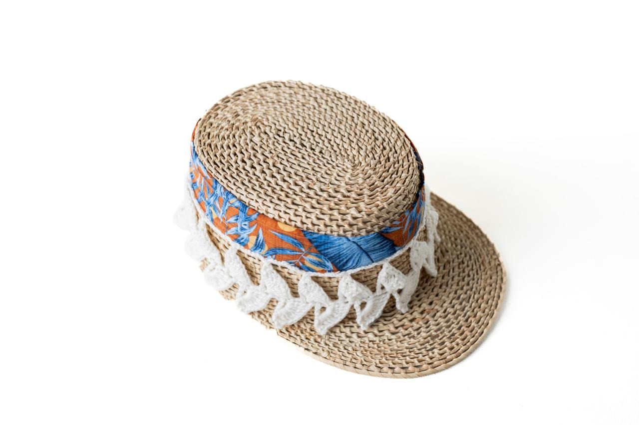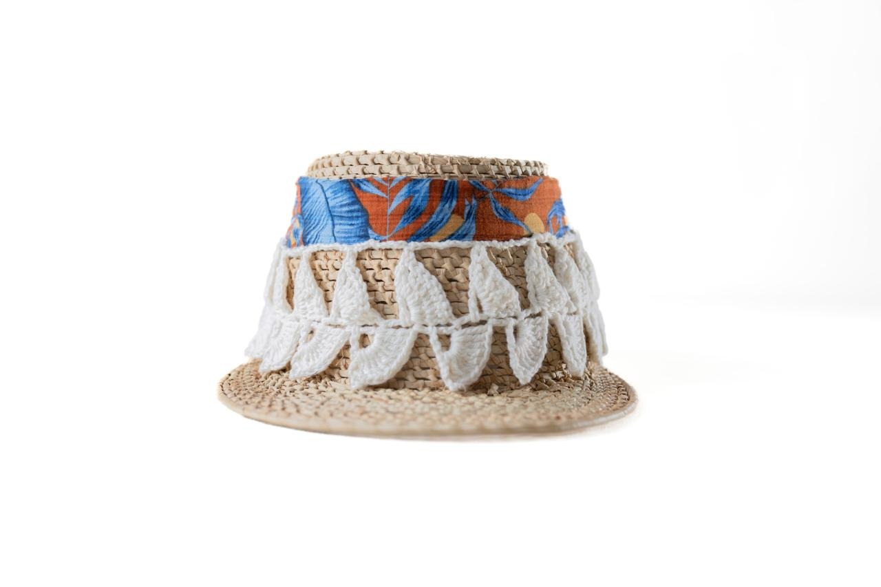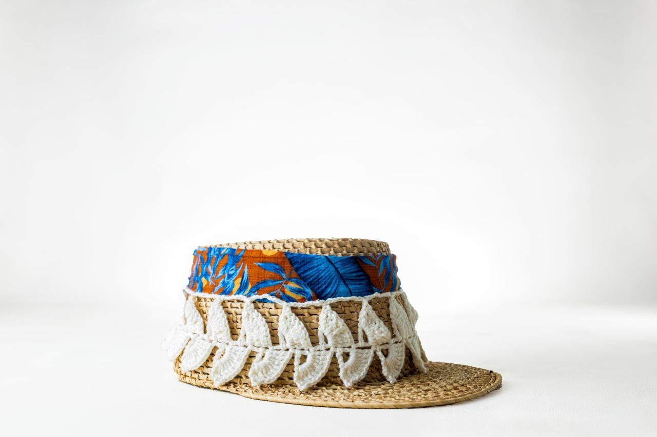 Material – Mateba, forrado com pano havaiana de Algodão e renda em crochet de linha 100% Algodão. Cor Bege e Tecido havaiana estampado com cores azul, castanho e branco
