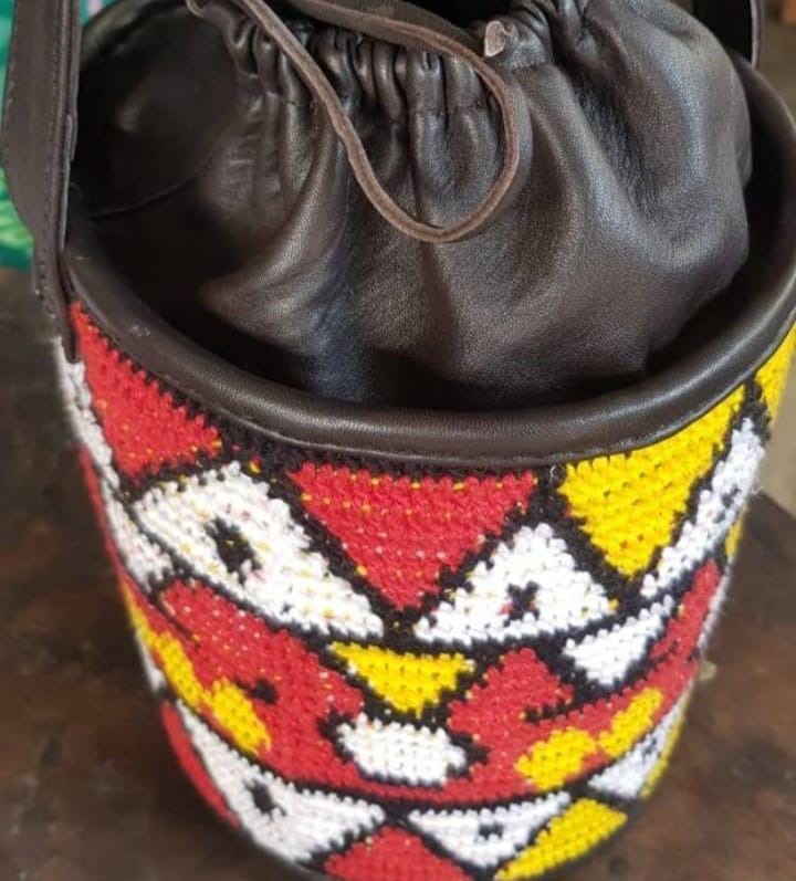 Couro natural, com forro exterior em crochet de linha 100% Algodão em cores de samakaka (vermelho, preto, amarelo e branco).