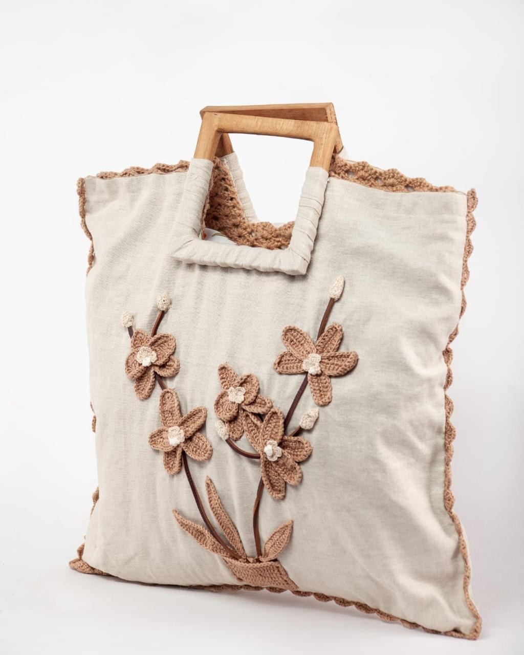 Pasta castanha clara de linho com forro castanho interior e exterior com motivos orquídea em crochet e alças em madeira. Materiais : tecido de linho, madeira e linha 100% algodão.