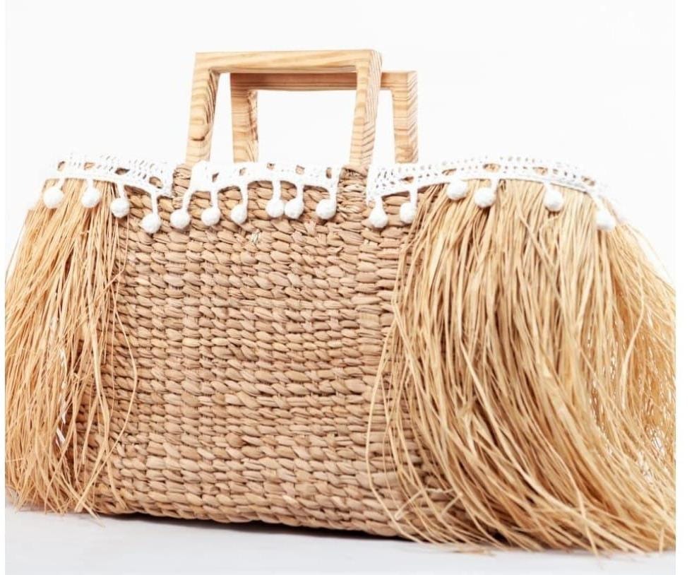 Pasta de material do Bengo com forro branco interior em crochet e franjas em palha. Materiais : Chipipa. palha, linha 100%, Algodão e linha impermeável própria para peças usadas na água.