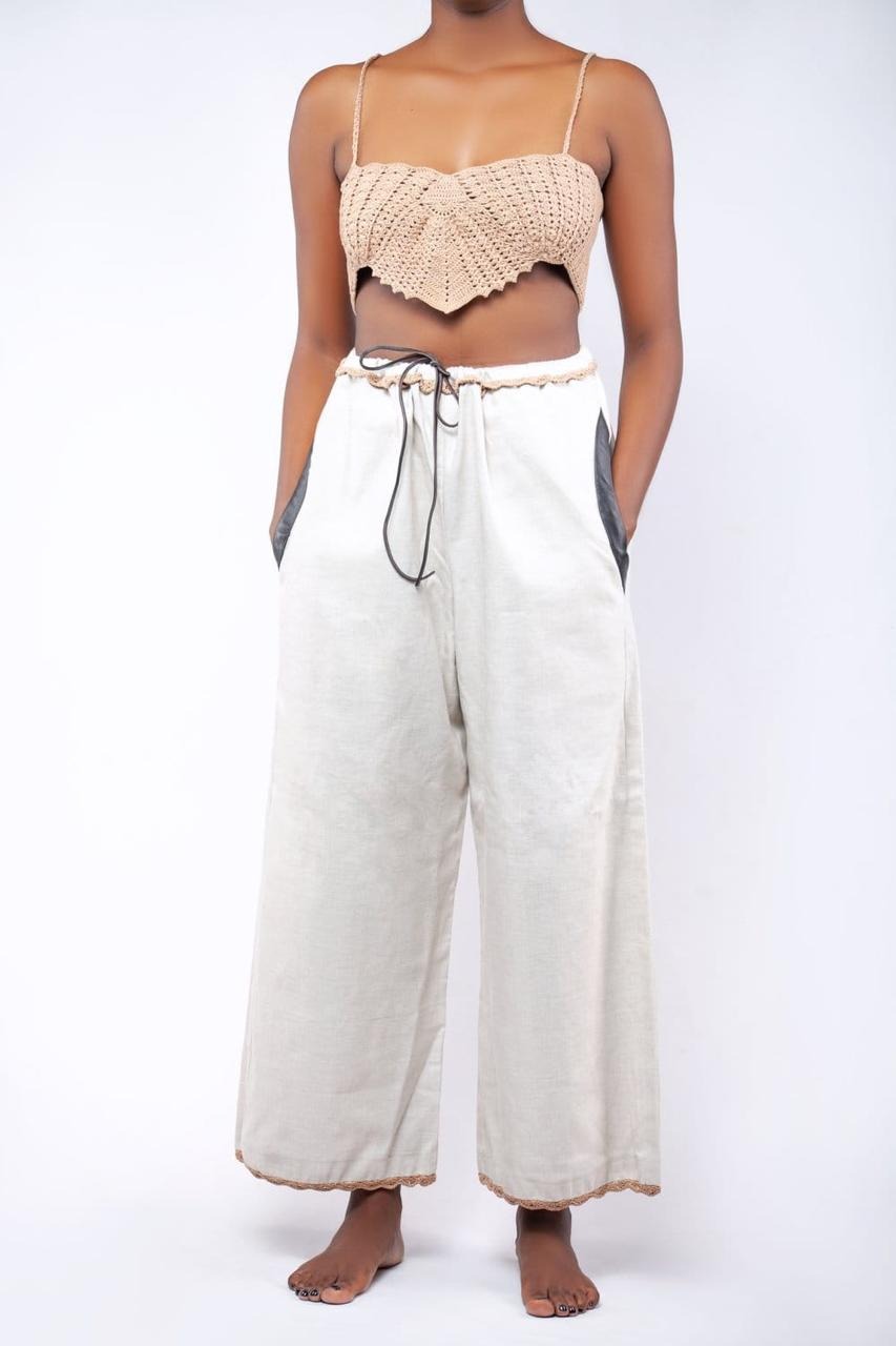 Top castanho. Materiais : tecido de linho, madeira e linha 100% algodão.