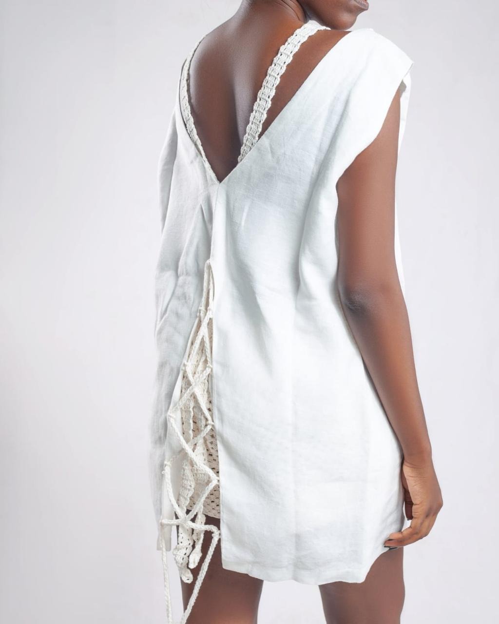 Túnica branca de linho. Materiais : mateba, fio de couro linha 100% algodão e linha impermeável própria para peças usadas na água.