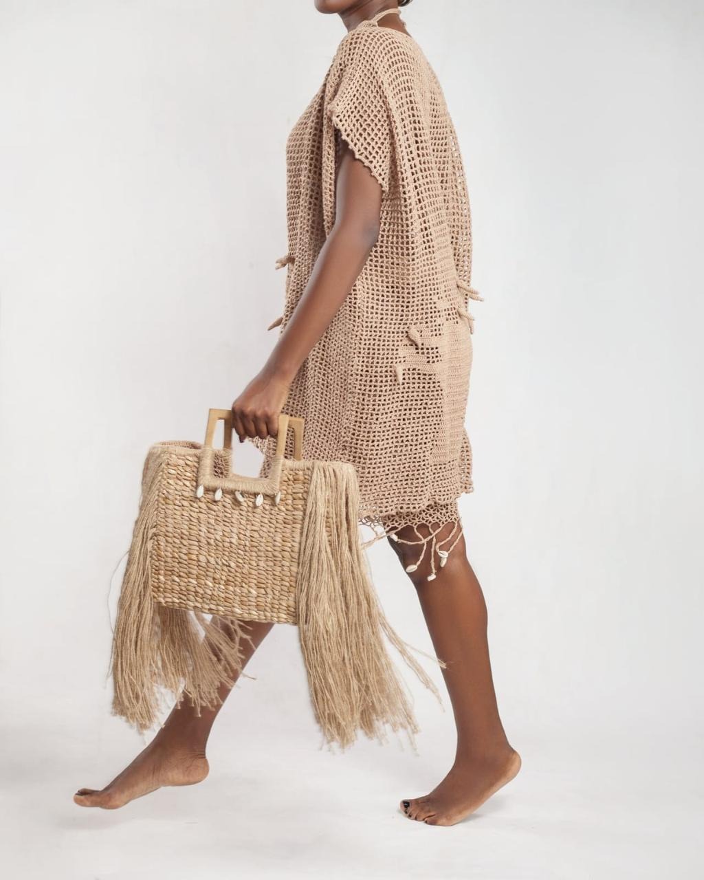 Túnica castanha com cinto em fio de couro castanho claro. Materiais : mateba, couro, linha 100%, algodão e linha impermeável própria para peças usadas na água.